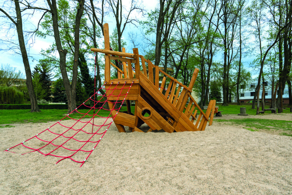 Unser Piratenspielplatz in der Arndtstraße lädt zu fantasievollen Abenteuern auf hoher See ein. Das gerade frisch erneuerte Piratenschiff kann über ein Fischernetz oder Taue erklommen werden. Beliebt ist außerdem die Seilbahn, mit der die Kinder einmal quer über das Gelände flitzen können – ein bisschen so, als würden sie sich an Bord eines gekaperten Schiffes schwingen. „Klarmachen zum Entern!“
